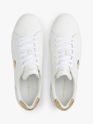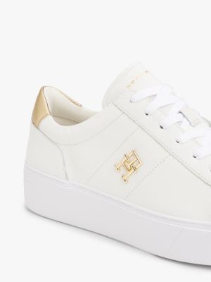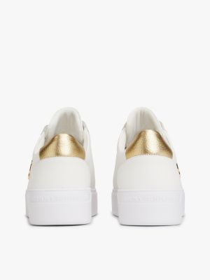 Metallic-Highlights verleihen diesem Court-Sneaker aus Leder mit Plateau-Sohle auffälligen Glanz.