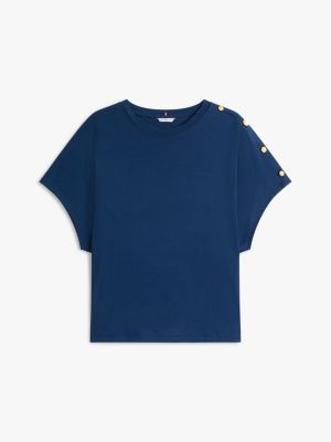 Dieses T-Shirt mit Seiden-Finish und goldfarbenen, geprägten Knöpfen an der Schulter verleiht jedem Alltagslook elegante Vibes.