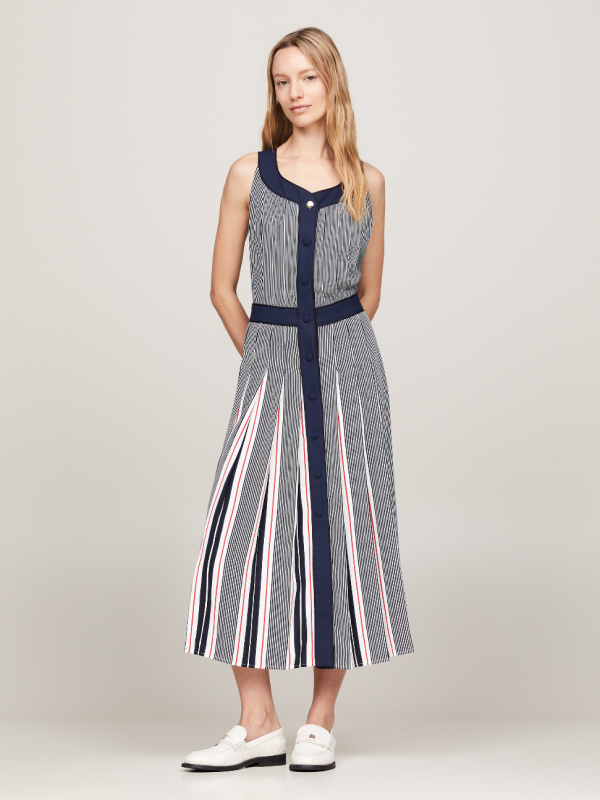 Mit den zeitlosen Kleidern von Tommy Hilfiger für Damen feiern wir unser modisches Erbe. Lass dich von der zeitlosen Eleganz maritimer Streifenkleider mit klassischen marineblauen und weißen Streifen verzaubern, die sich perfekt mit Flats oder Espadrilles kombinieren lassen. Mit unseren schicken Midikleidern, die mit raffinierten Details verziert sind und ideal zu stilvollen Stiefeletten passen, kannst du den Retro-Look aufgreifen. Und für besondere Anlässe bieten unsere stilvollen Minikleider einen Hauch von Raffinesse, ob mit High Heels zum Ausgehen oder Sandalen für eine entspannte Tagesveranstaltung kombiniert. Werte deine Garderobe mit den Kleidern von Tommy Hilfiger auf und setze ein Statement, wo immer du hingehst.