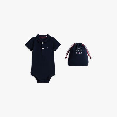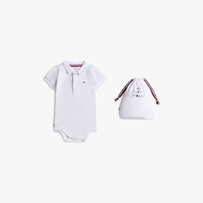 Dieses süße Geschenkset umfasst einen Poloshirt-Body aus Stretch-Baumwoll-Piqué und einen Beutel mit Tunnelzug und Branding.