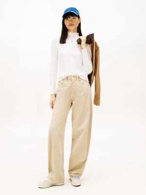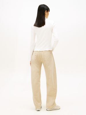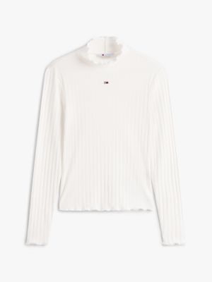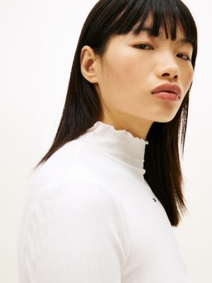 Bei diesem Slim Fit Top mit Mock Neck und verspielten Rüschen trifft raffinierter Pointelle-Jacquard auf eine gerippte Struktur.