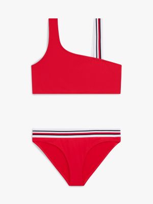 Dieser Bikini mit einem integrierten Träger und einem Träger samt Global-Streifen ist die perfekte Wahl für einen auffälligen Look am Strand oder Pool.