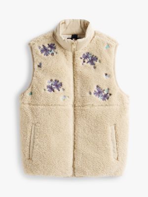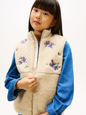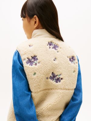 In der Übergangszeit ist diese flauschige Teddy-Weste mit aufwendiger Blumenstickerei eine hervorragende Wahl.