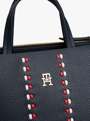 Diese vielseitige Satchel lässt sich auf verschiedene Arten tragen, während das Tommy-Tape für einen auffälligen Look sorgt.