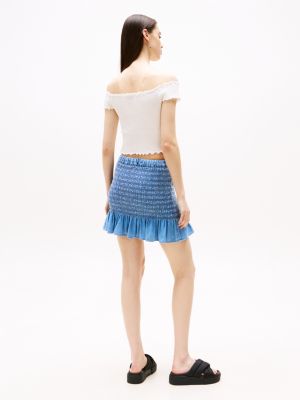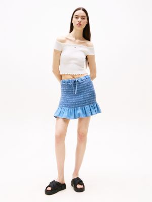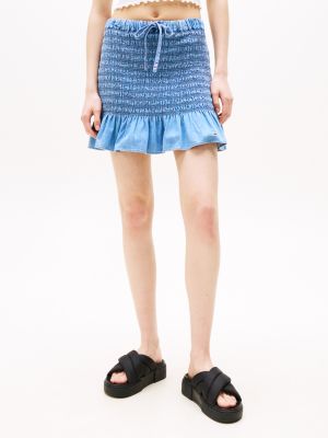 Verlängere den Sommer dank diesem coolen Slim Fit Chambray-Minirock mit Raffungen und Branding.